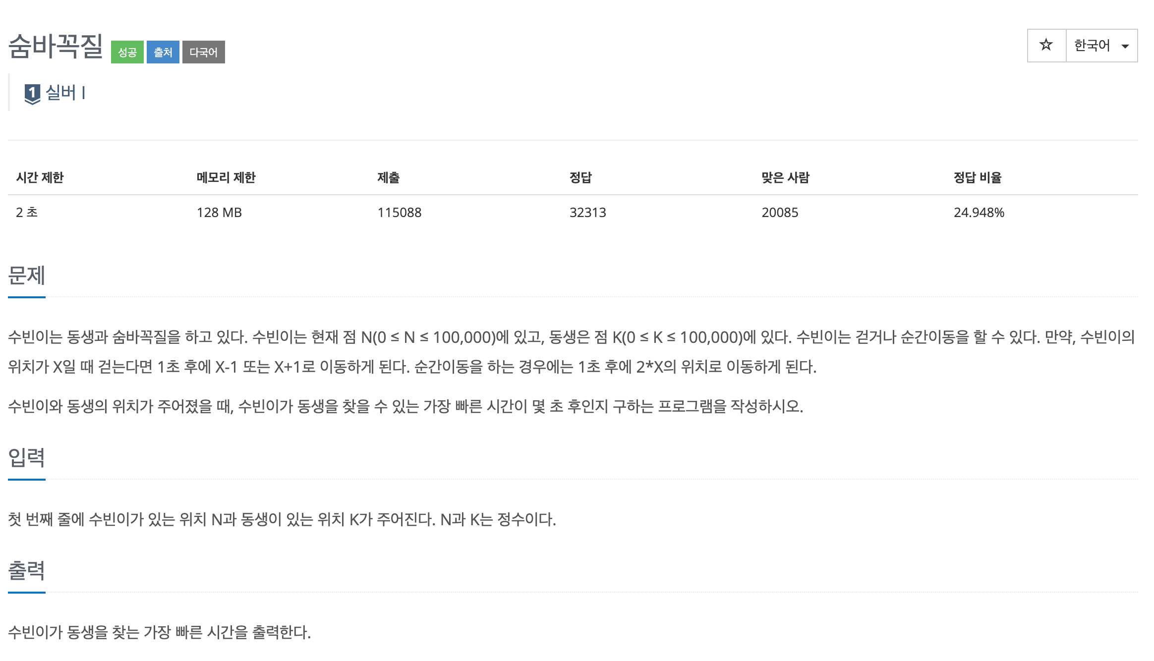 수빈이는 동생과 숨바꼭질을 하고 있다. 수빈이는 현재 점 N(0 ≤ N ≤ 100,000)에 있고, 동생은 점 K(0 ≤ K ≤ 100,000)에 있다. 수빈이는 걷거나 순간이동을 할 수 있다. 만약, 수빈이의 위치가 X일