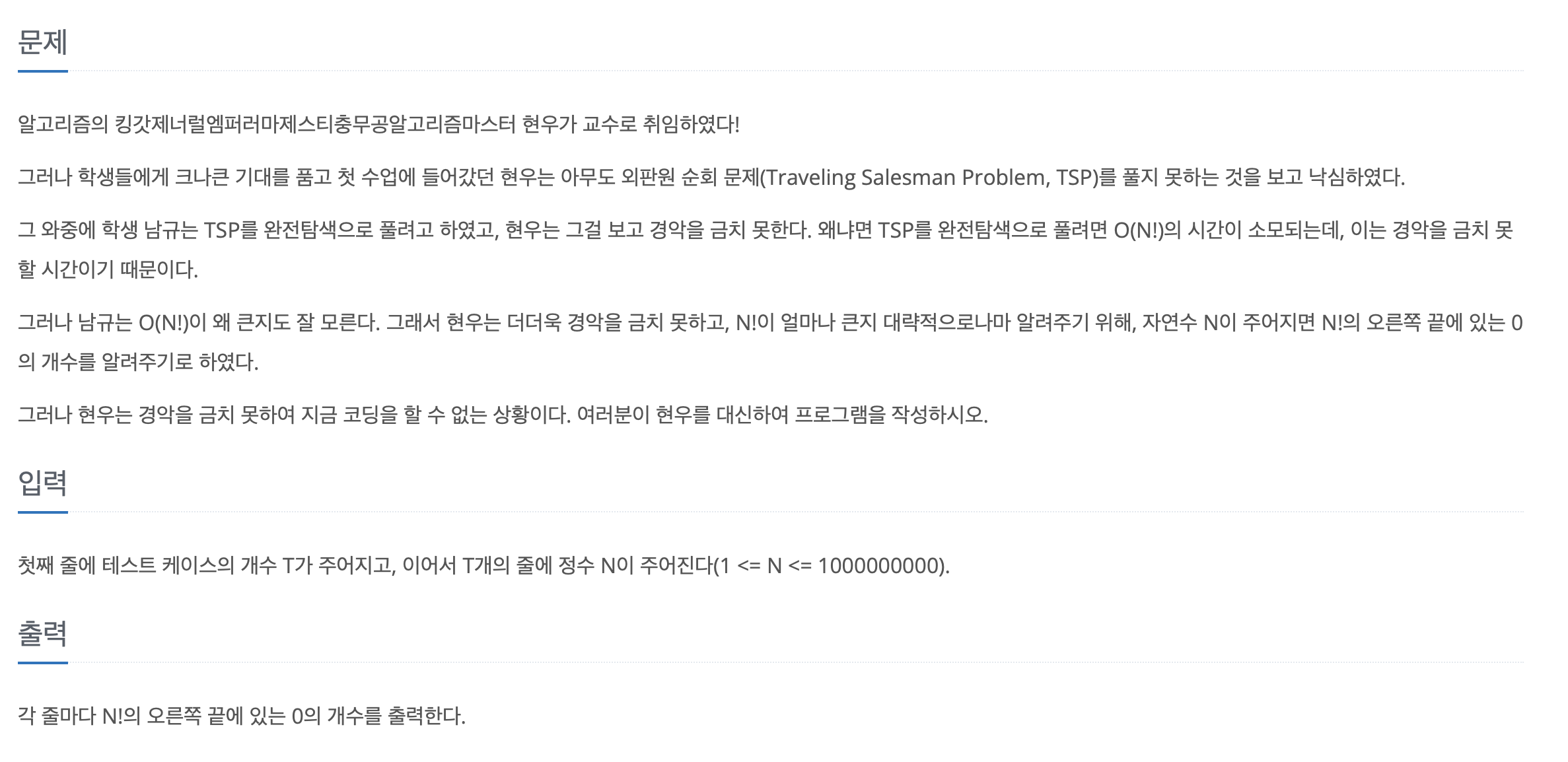 백준 알고리즘 문제 3474번 교수가 된 현우 문제이다.