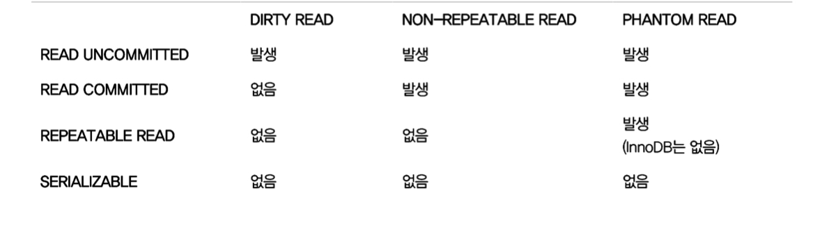표에 나와있는 Dirty Read, Non-Repeatable Read, Phantom read에 대해서는 격리 수준을 설명하면서 같이 하면 좋을 것 같다.