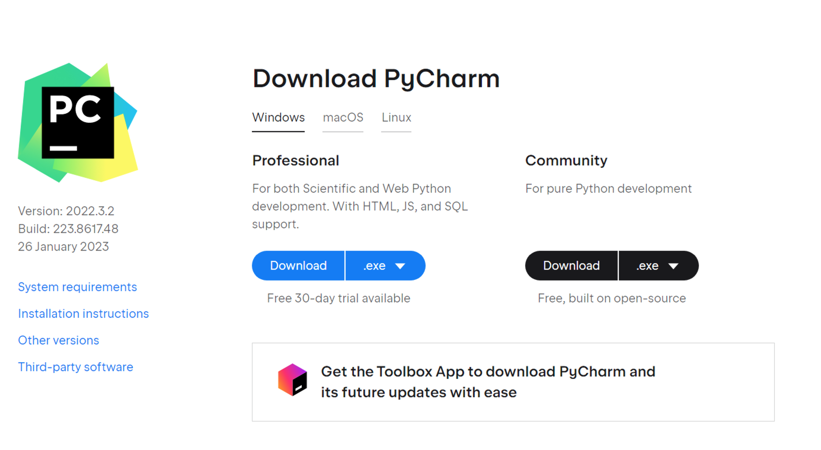 https://www.jetbrains.com/ko-kr/pycharm/download/#section=windows