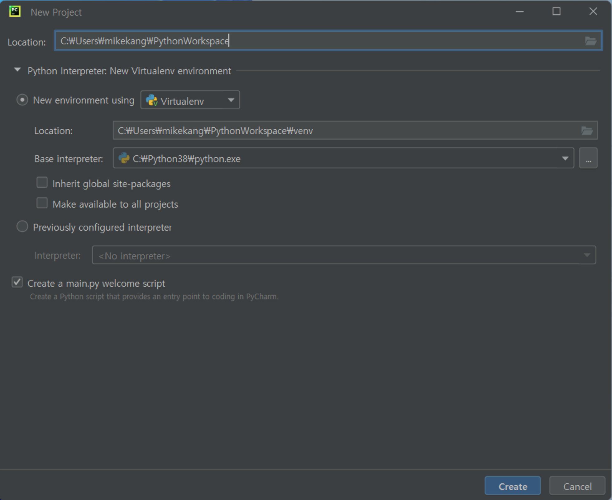 9. 책처럼 하위 PythonWorkspace라는 폴더를 생성해 위치로 설정합니다. 그리고 create를 누르면 완성!