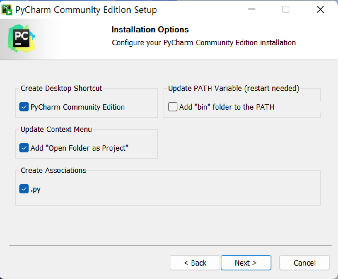 5. 바탕화면 바로가기, 폴더를 프로젝트로 열기, .py 파일을 pycharm으로 열기를 선택합니다.
