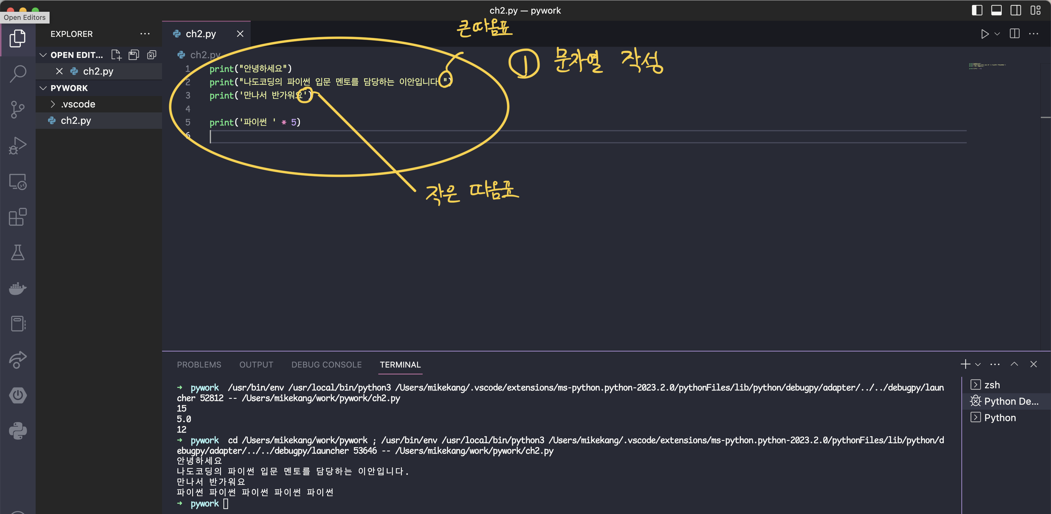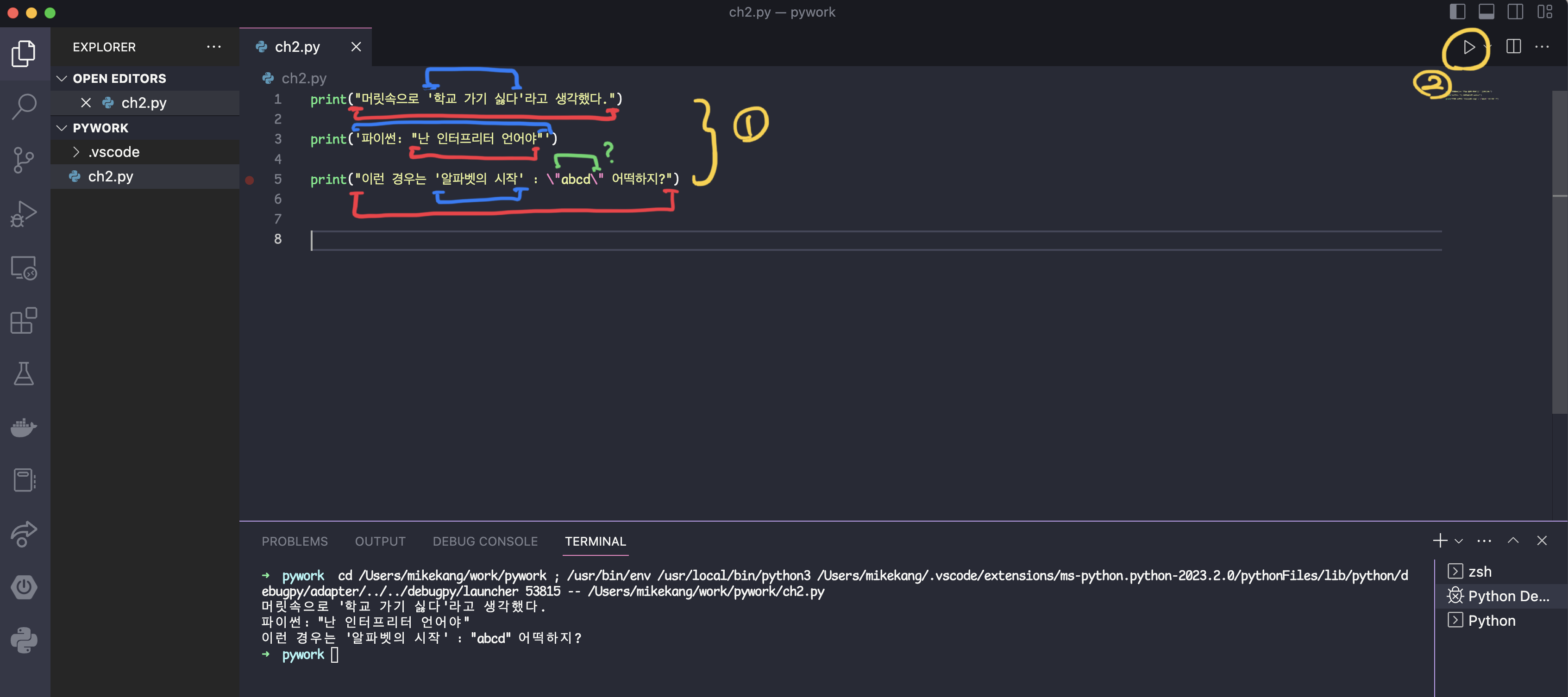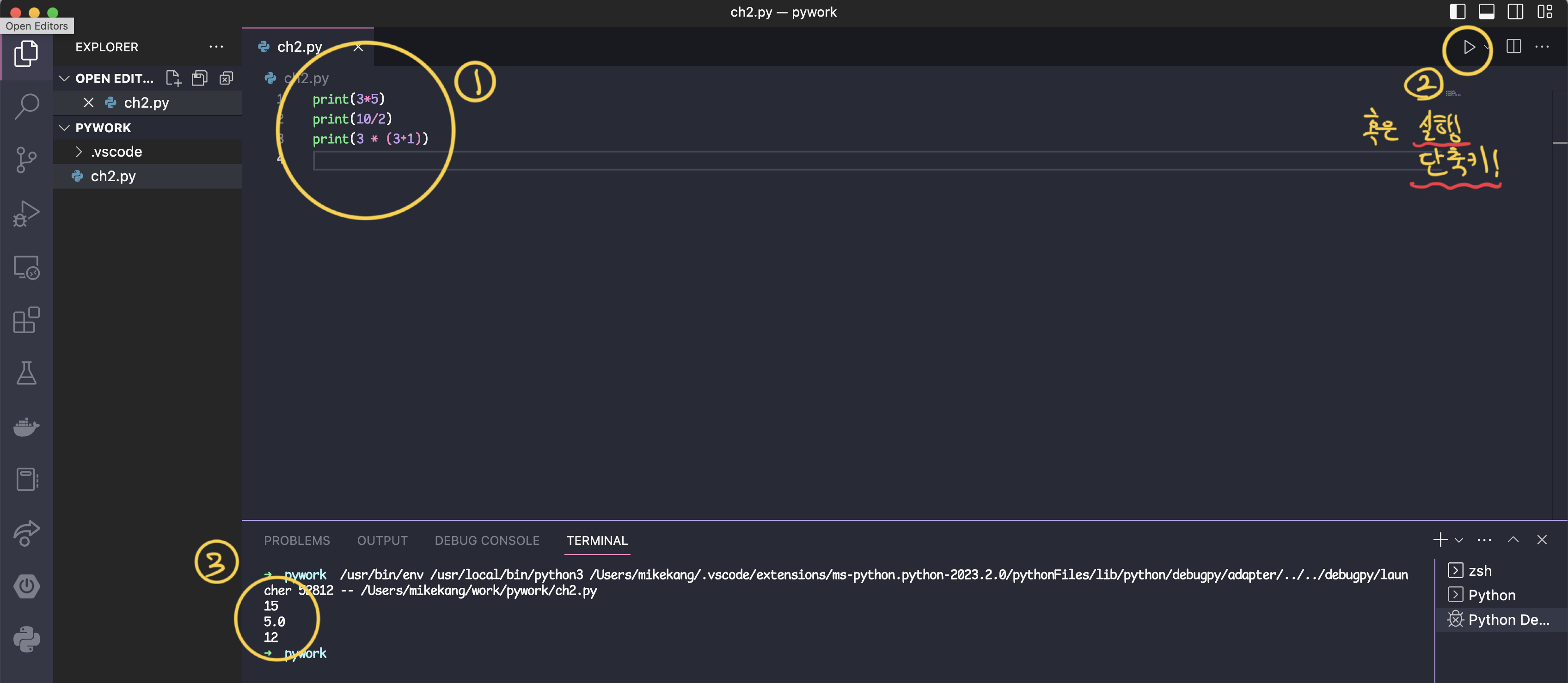 - 먼저 책의 내용을 그대로 따라 ch2.py 파일을 만들어주세요!