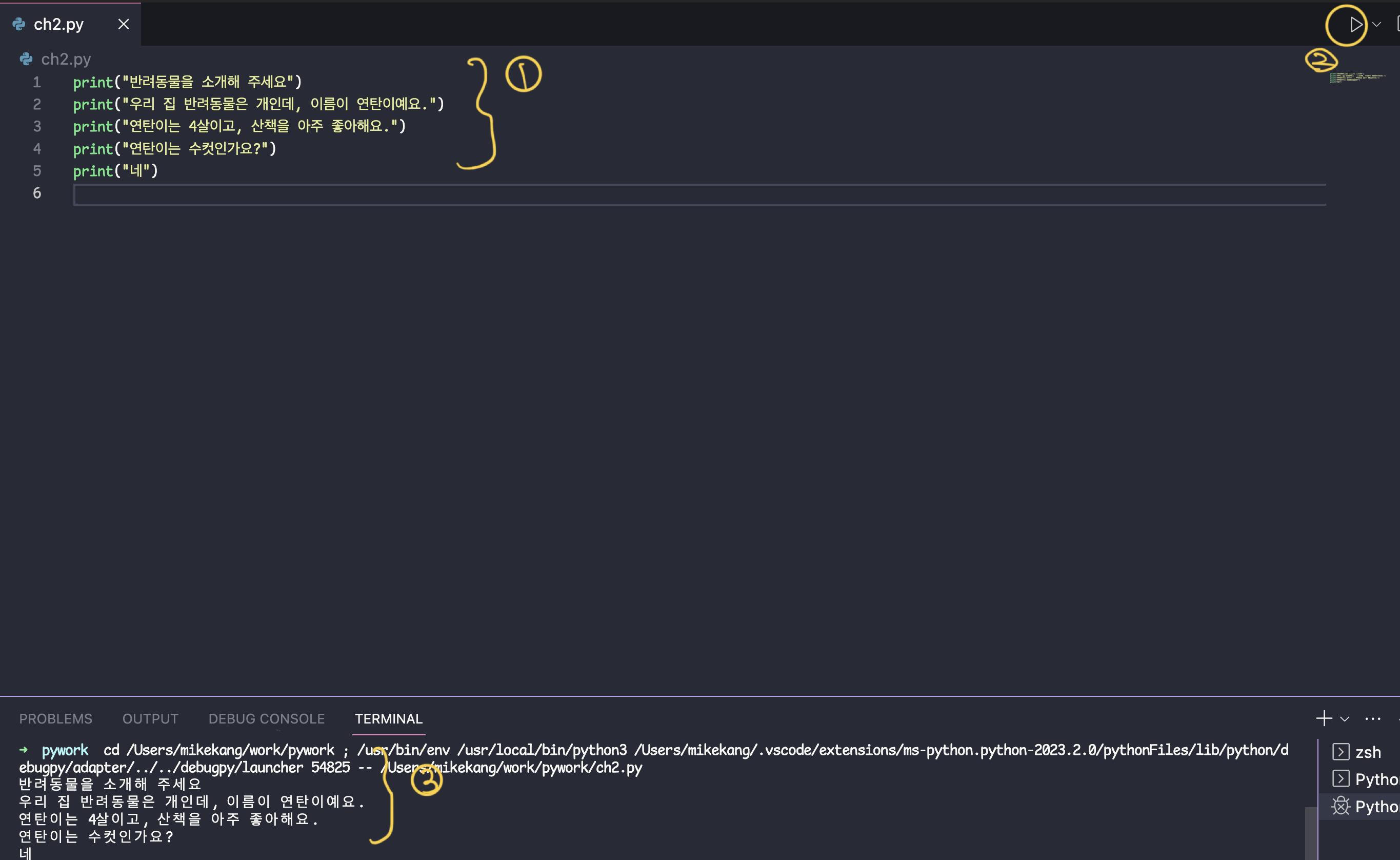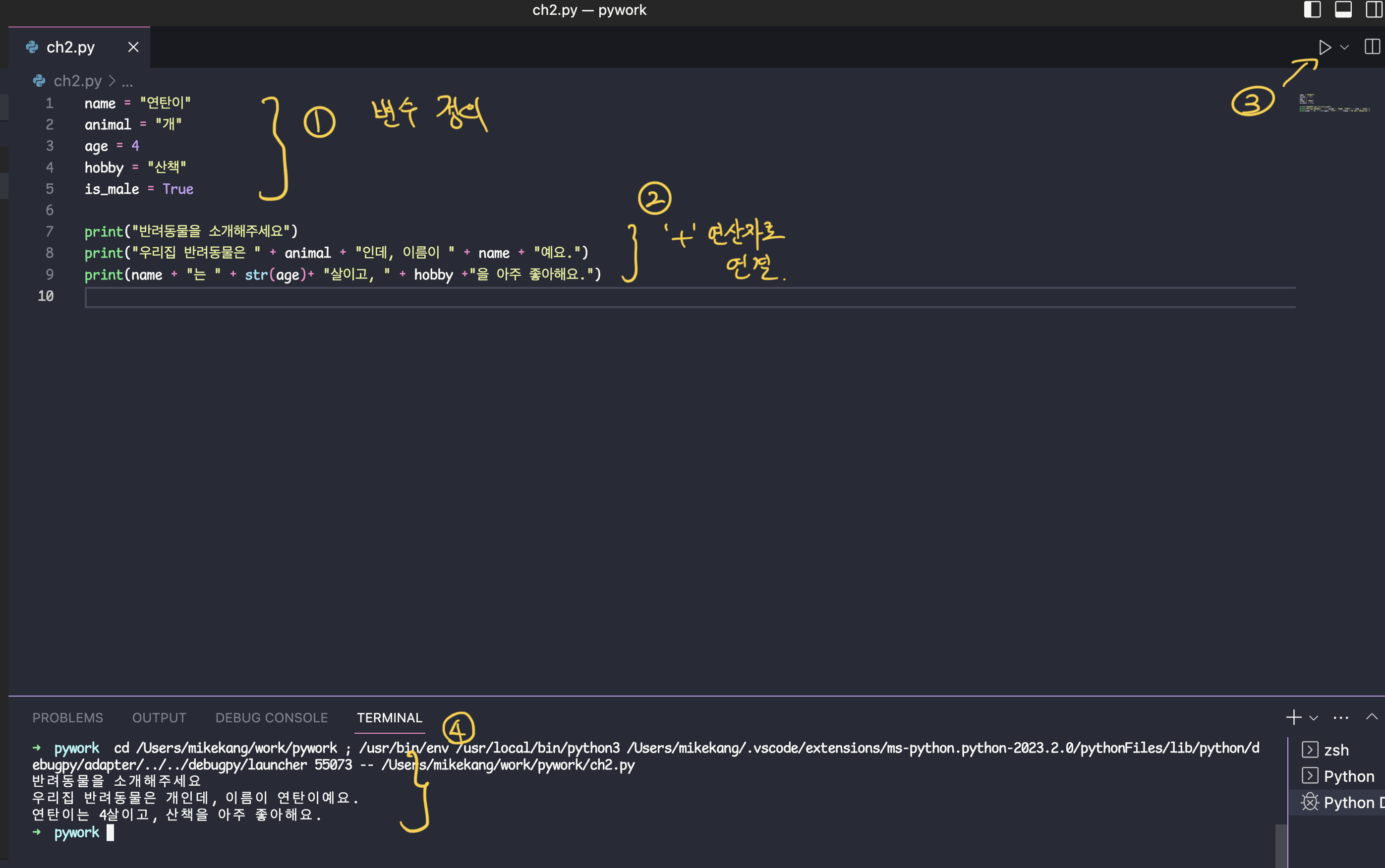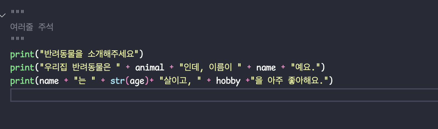 print("우리집 반려동물은 " + animal + "인데, 이름이 " + name + "예요.")