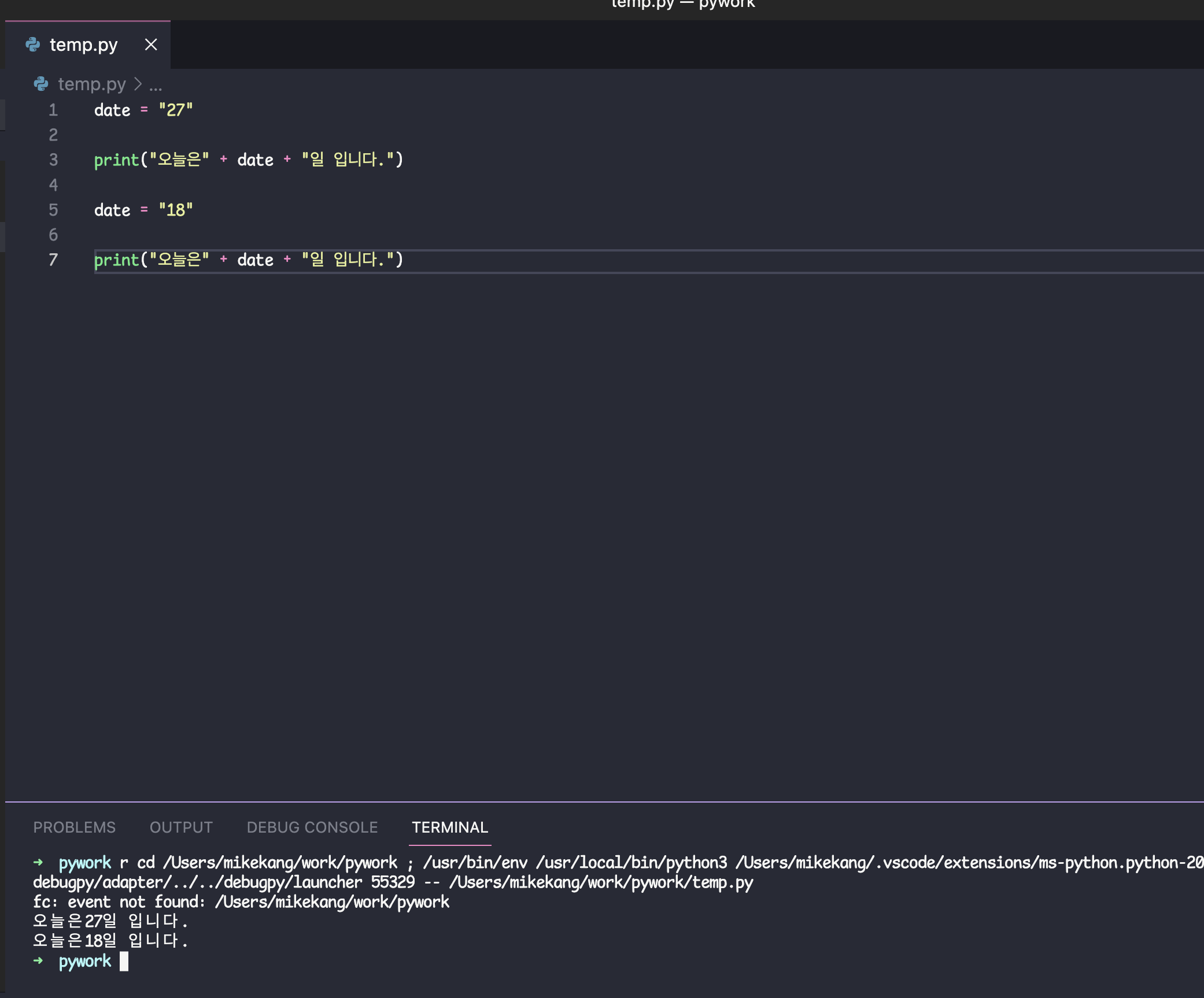 2. 문자열을 출력한 결과로 "오늘은 27일입니다."가 출력됐습니다.