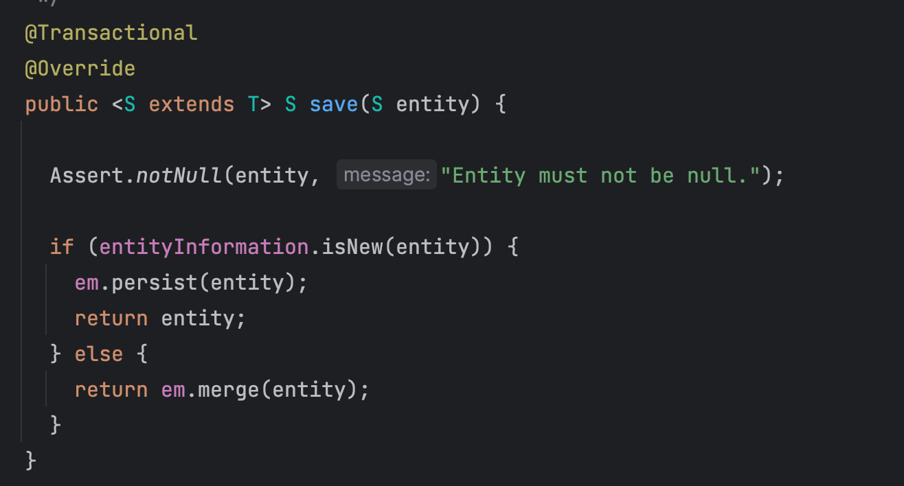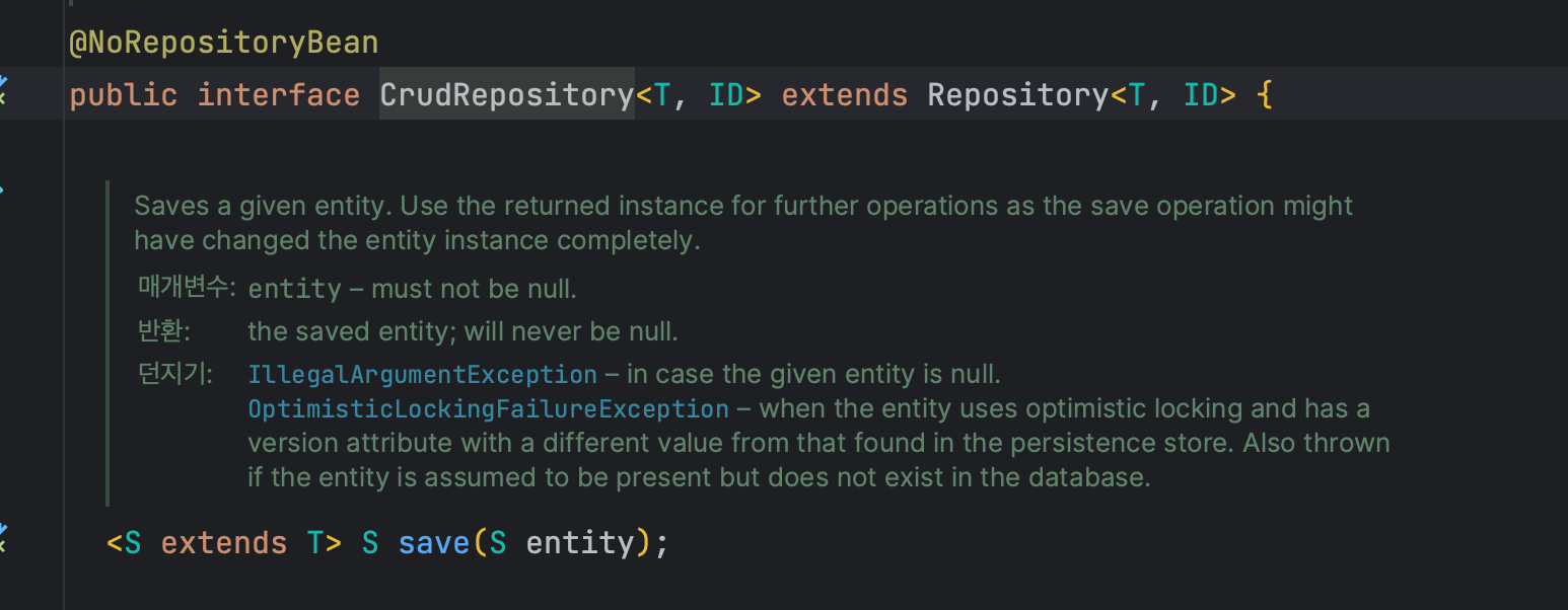 이렇게 상속의 트리를 타고 올라가면 CrudRepository가 존재하고, 여기에 save 추상 메서드가 정의되어 있습니다.
