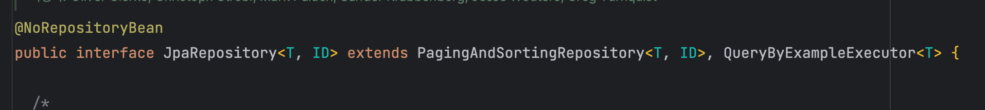 심지어 JpaRepo, 상위 인터페이스인 PagingAndSoringRepo, CrudRepo 모두 인터페이스입니다.