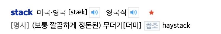 stack은 '무더기', '쌓아놓은 더미' 등을 가리키는 명사의 뜻과 '쌓다'라는 동사의 뜻이 있다.