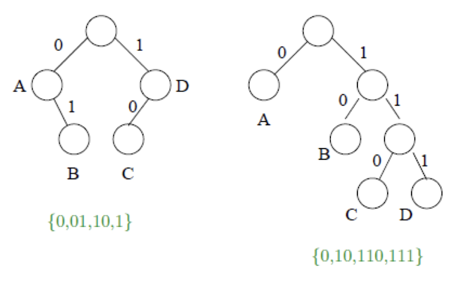 첫 번째 트리는 {A, B, C, D} 는 {0, 01, 10, 1} 로 표현된다. 하지만 이는 prefix-free코드가 아니기 때문에 모호성이 발생한다.