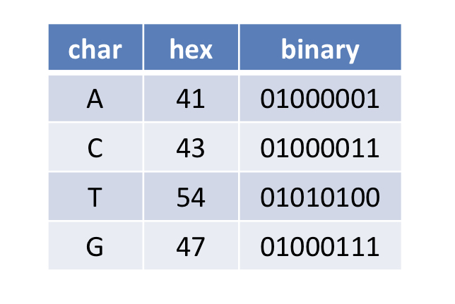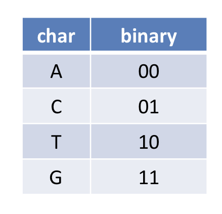 염기서열을 ASCII코드로 변환하여 이진수로 나타내면 다음과 같다.
