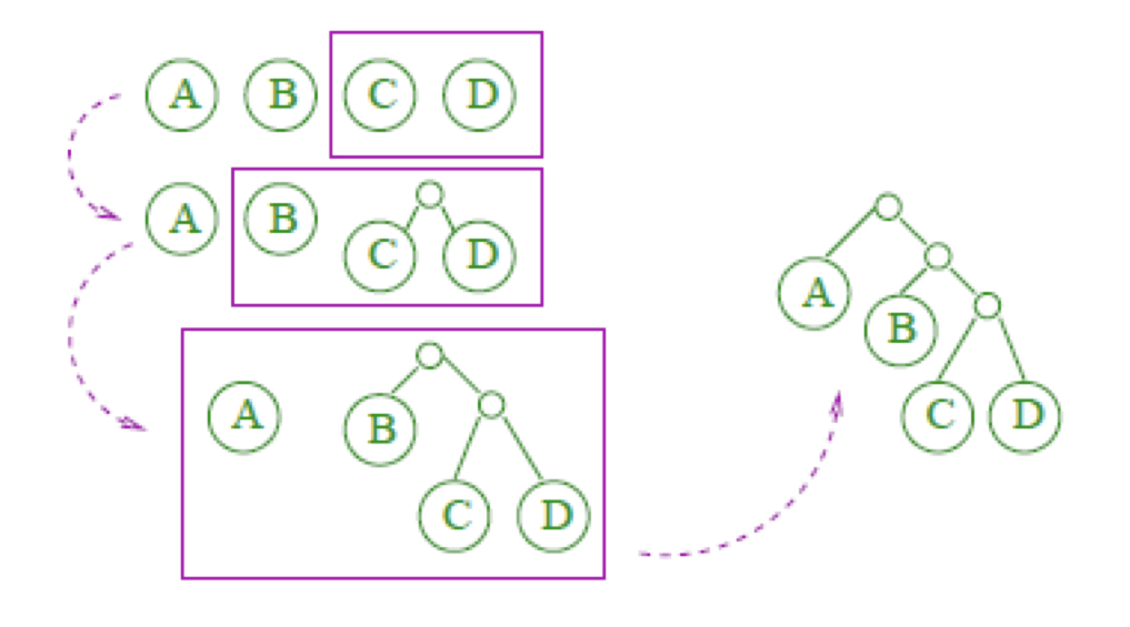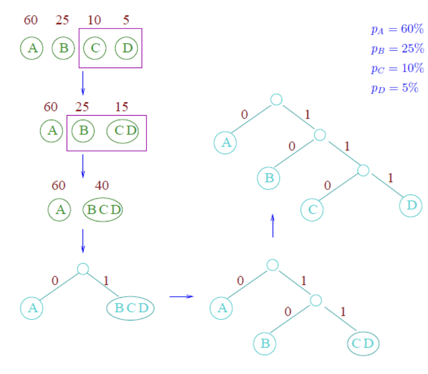 위의 경우 A가 60%, B가 25%, C가 10%, D가 5%로 출현 빈도가 낮은 순으로 병합하여 트리를 구성한 것이다.