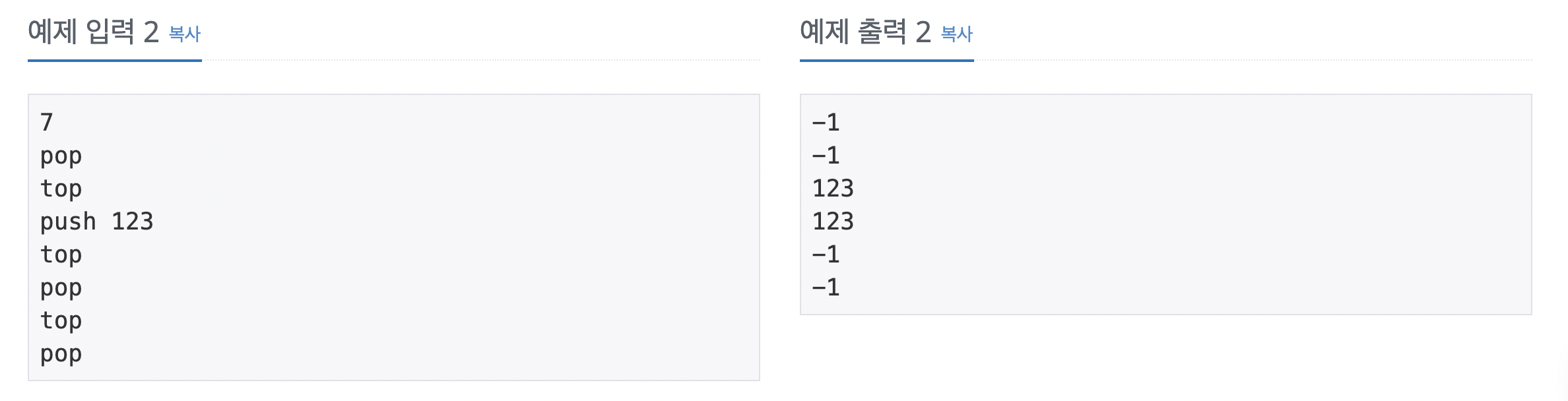 이 문제에서 해결해야하는 문제는 2개가 있는데 pop을 했을 때 -1을 출력하는 것과