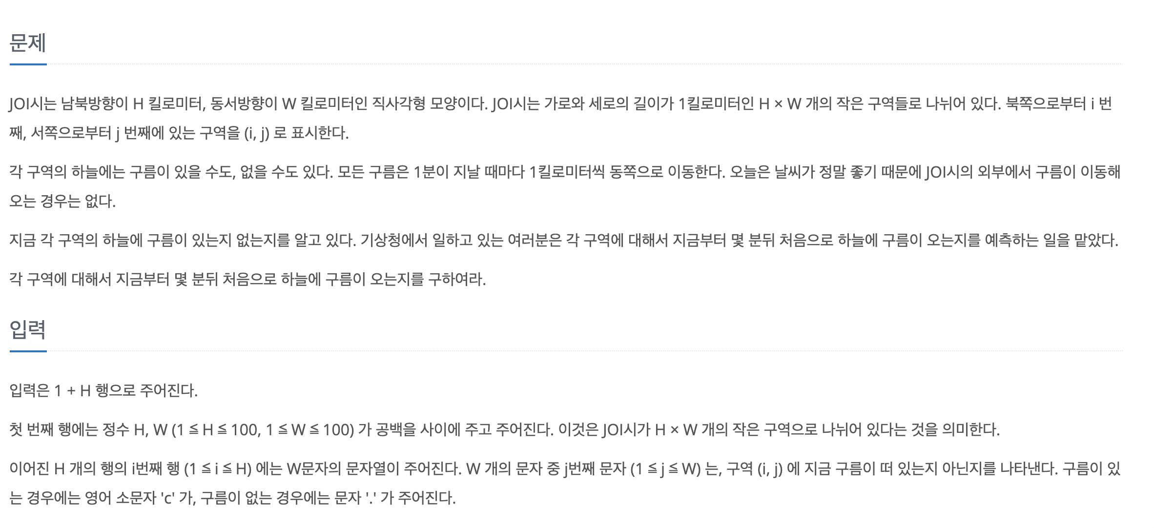 문제를 요약하면 원래 C가 있던 자리에는 0을, 구름이 나타나지 않으면 -1을 그게 아니면 몇 분 후에 구름이 나타나는지 표시하면 된다.