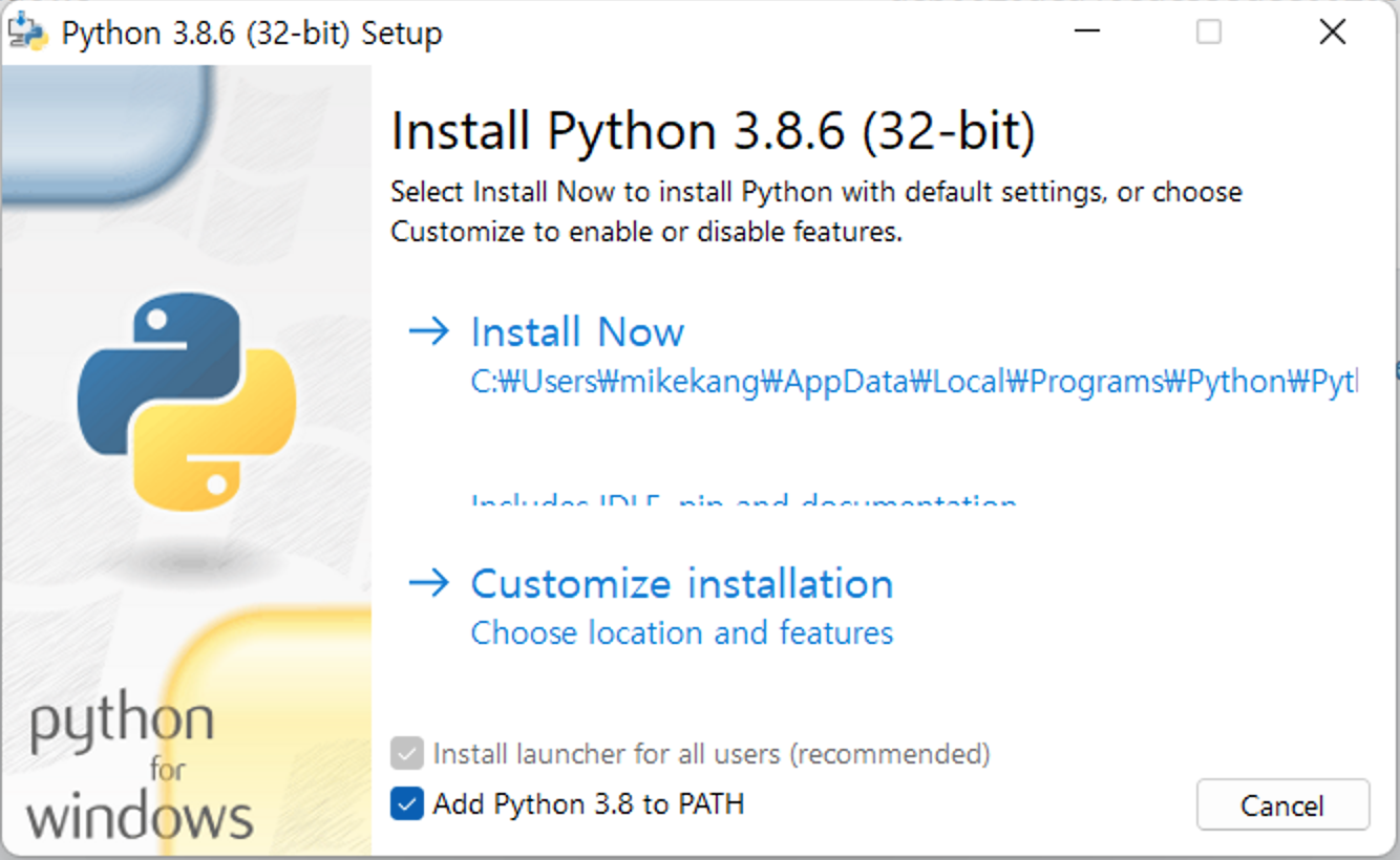 설치를 진행하는 도중 첫 화면에서 아래의 Add Python 3.8 to PATH를 꼭 체크해 주세요!