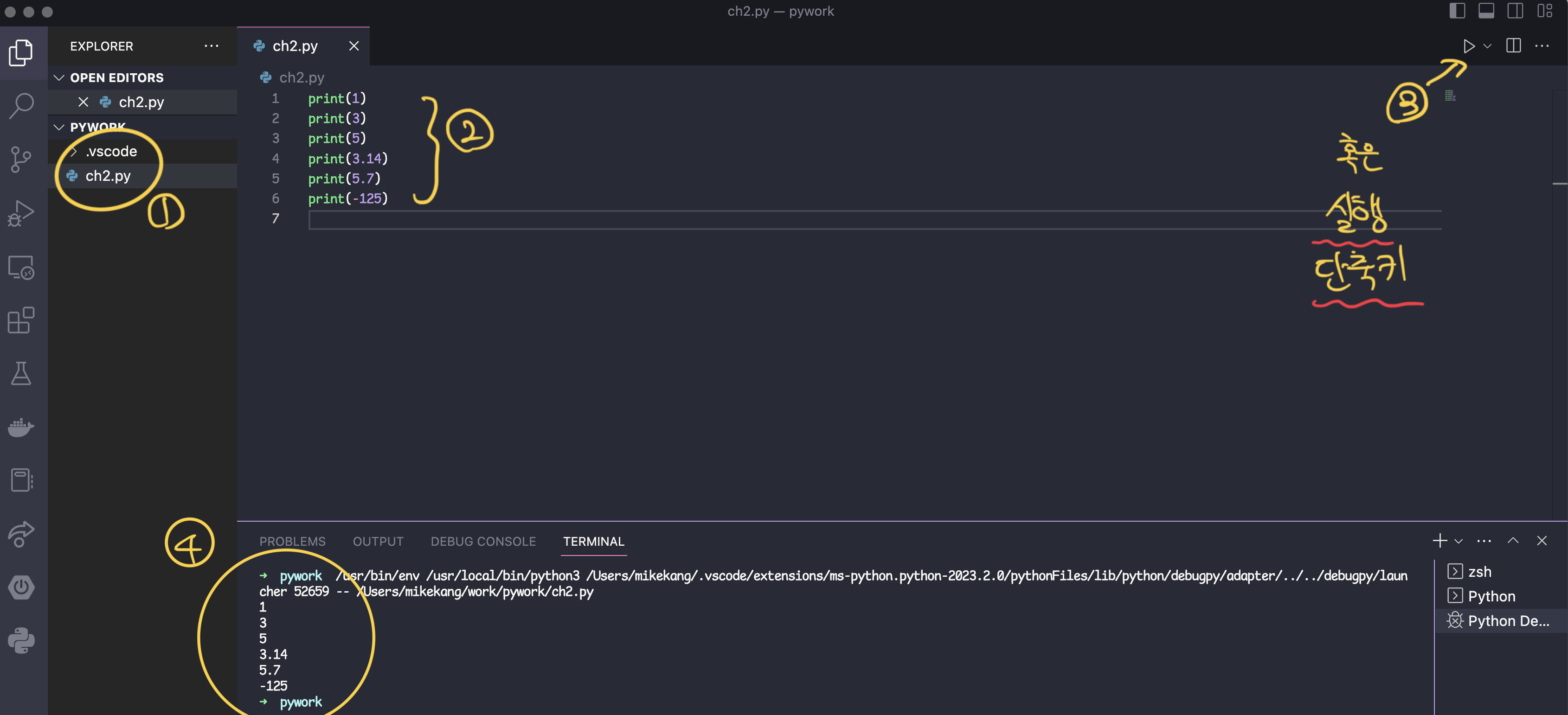 - 출력하고 싶은 숫자를 print 문의 () 괄호 안에 넣어 코드를 작성합니다.